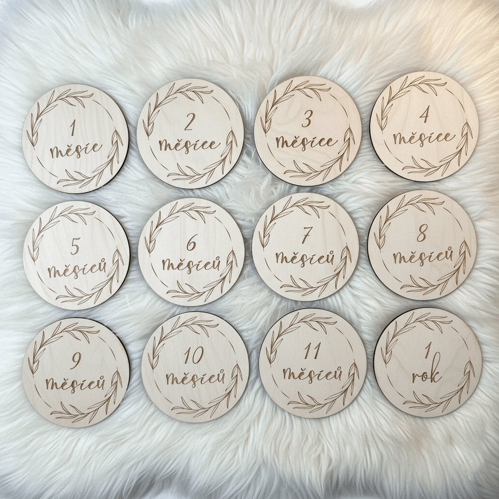 Dřevěné milníkové kartičky se vzorem květinového kruhu v minimalistickém stylu. Sada obsahuje 1x kartičku ahoj světe, 11 kartiček s číslem měsíce a jednu kartičku s nápisem jeden rok.