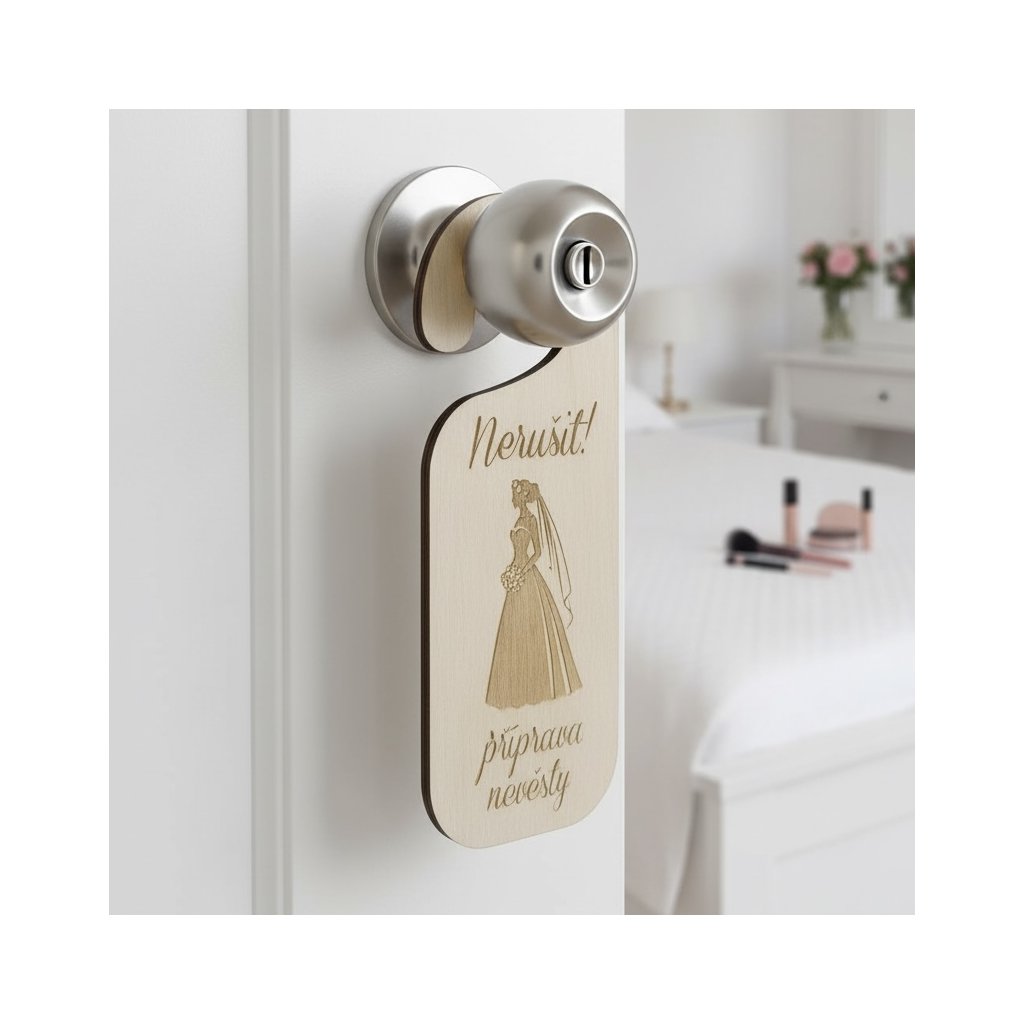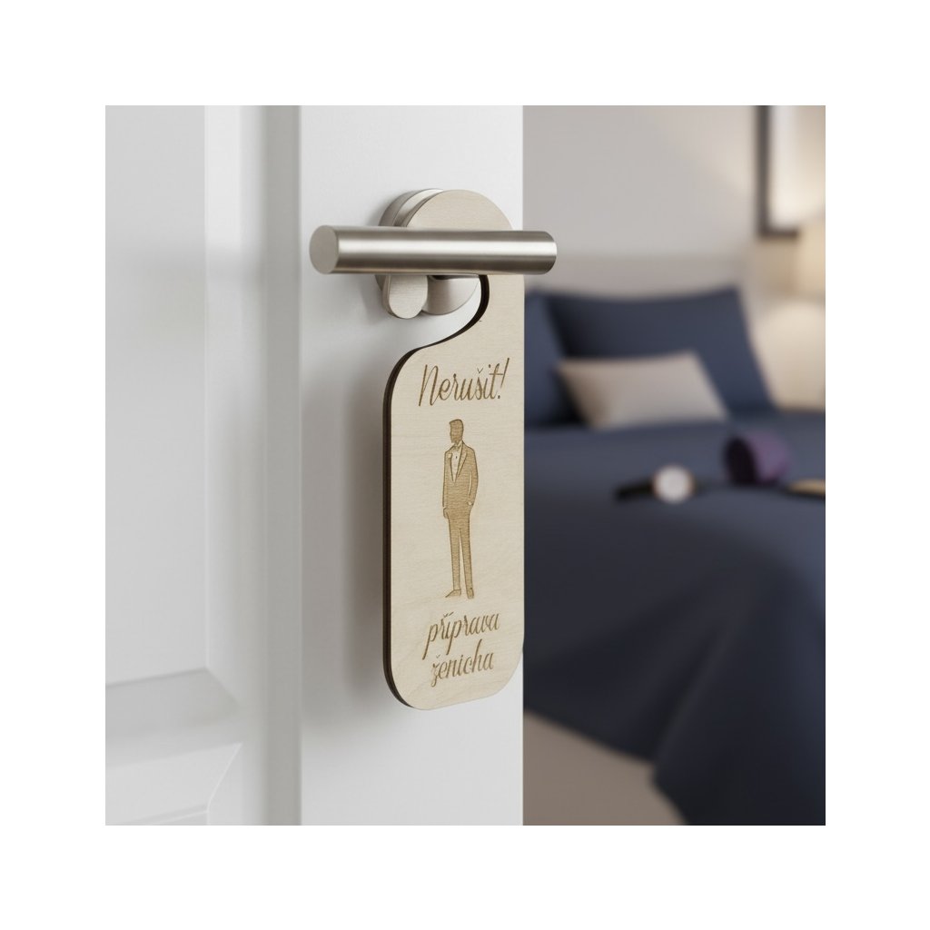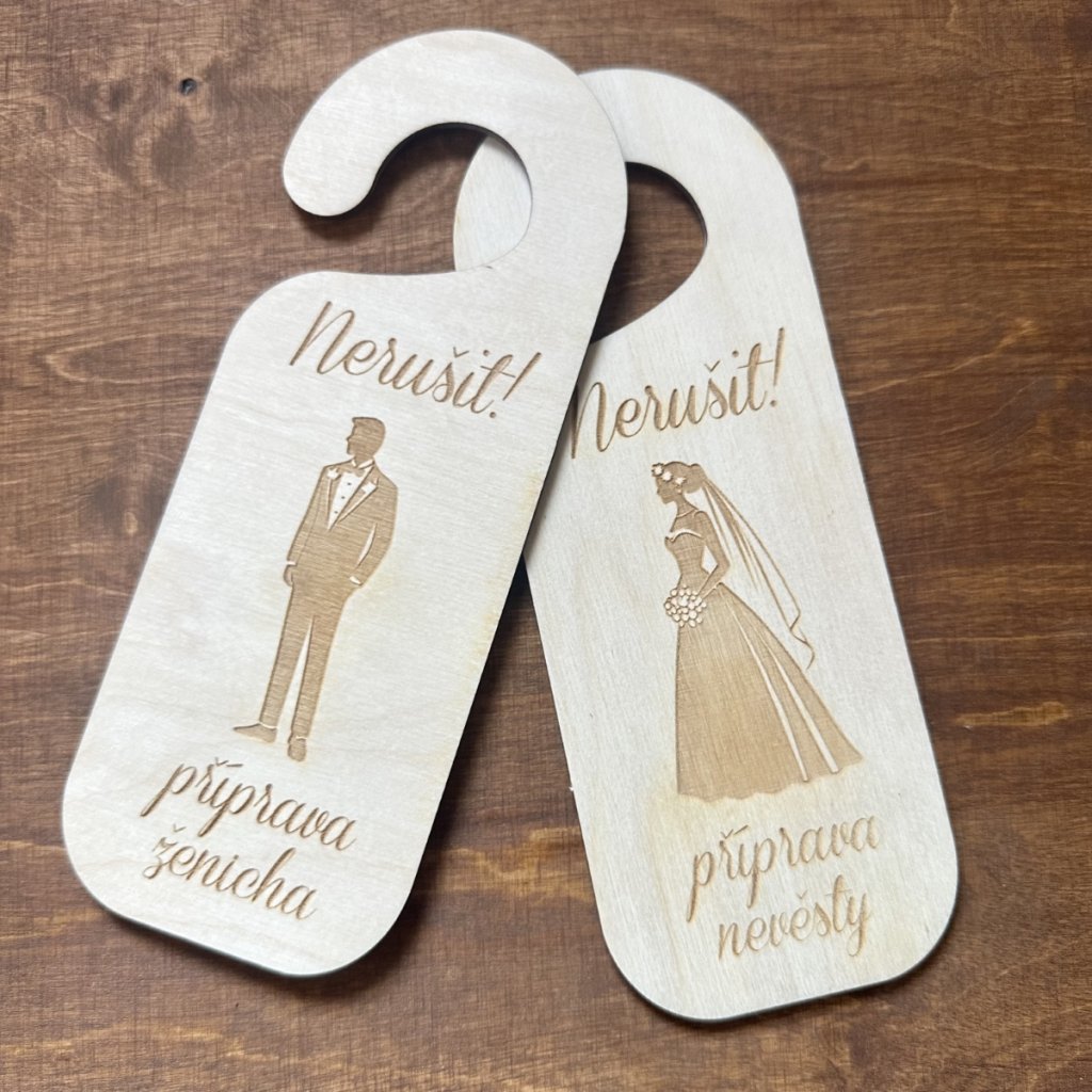 Elegantní sada dvou dřevěných visaček na kliku dveří s nápisem NERUŠIT přináší budoucím novomanželům zasloužený klid a soukromí. Stylový doplněk pro svatební den, který potěší svou originalitou a využitím.