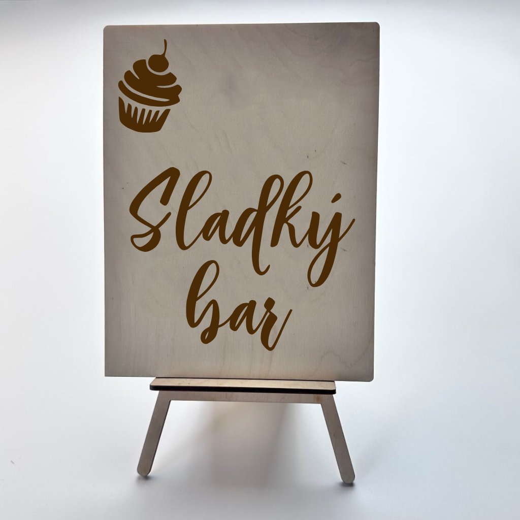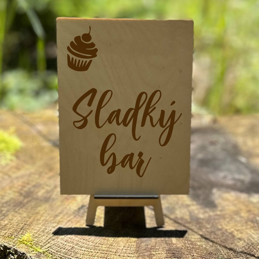 Oživte svůj sladký bar na svatbě nebo jiné slavnostní akci originální dřevěnou cedulkou. Tato dekorace krásně označí místo s dorty a dezerty, sjednotí celkový vzhled výzdoby a dodá prostoru elegantní a sladěný vzhled. Dřevěná cedule na sladký bar je perfektní volbou pro ty, kteří chtějí mít svatební výzdobu do detailu promyšlenou.